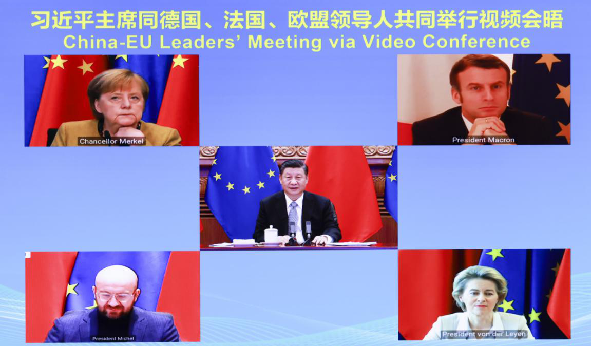 2020年12月30日晚,国家主席习近平同德国、法国、欧盟领导人共同举行视频会晤。