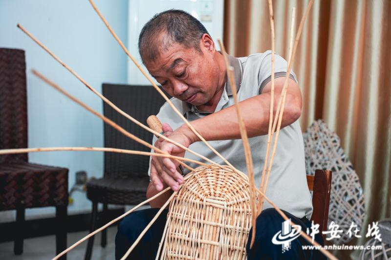 在编织工区,"霍邱柳编"市级非遗传承人沈家明一边熟练地编织着花篮,一边介绍:“霍邱柳编起源于周朝,就传统花瓶而言,从上经盘底到收口、拿沿,几乎不用什么工具,但编织出来的产品结构严密,形体圆润。”