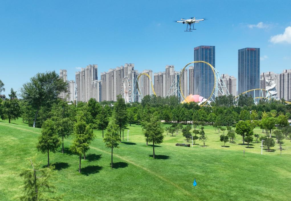 8月15日,在合肥市包河区,一架无人机在运送外卖(无人机照片)。新华社记者 周牧 摄