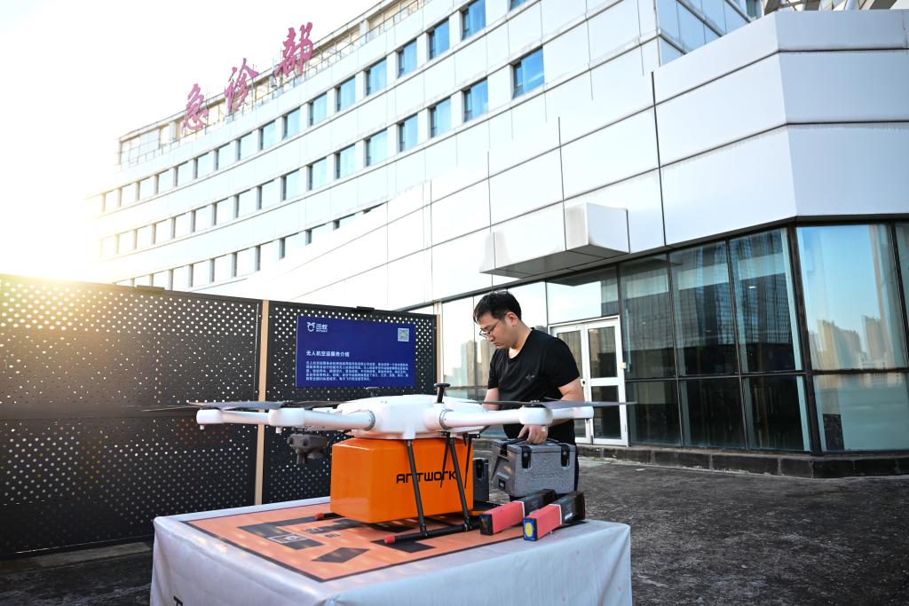 8月15日,在合肥市第一人民医院滨湖院区,工作人员从无人机上取下运输的血液。新华社记者 周牧 摄