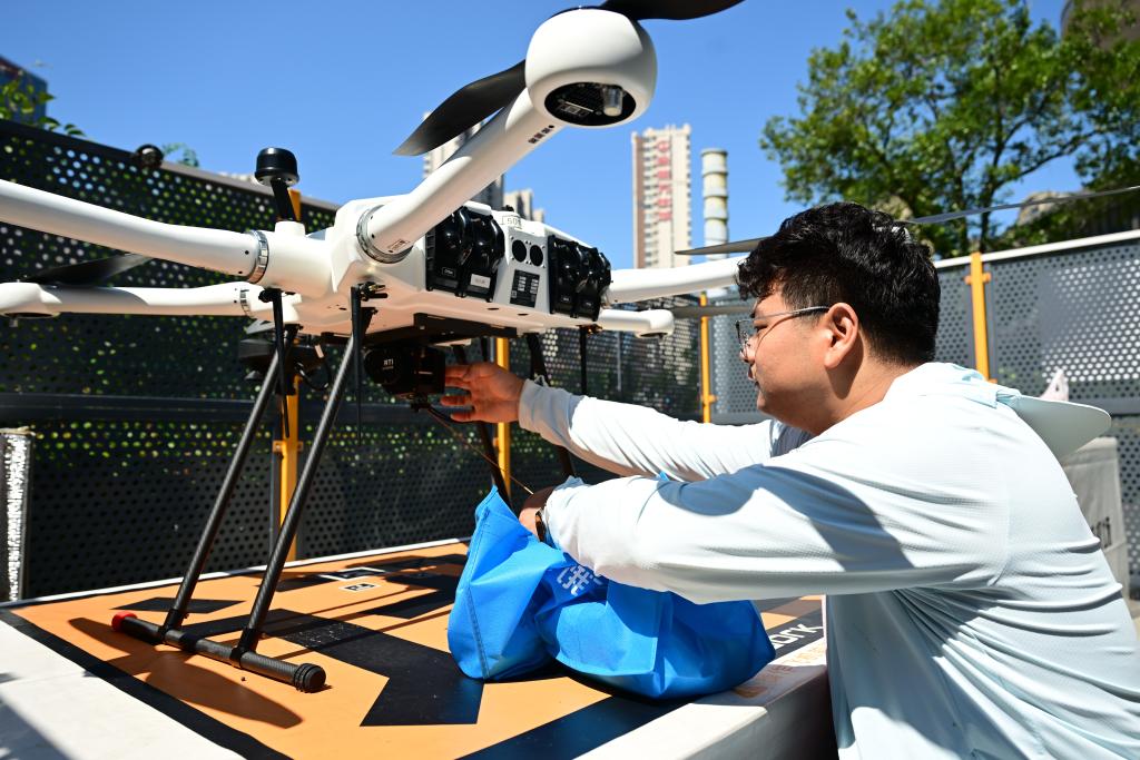 8月15日,在合肥市包河区一个无人机起降场,工作人员将准备运送的外卖挂到无人机下方。新华社记者 周牧 摄